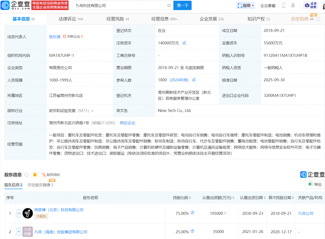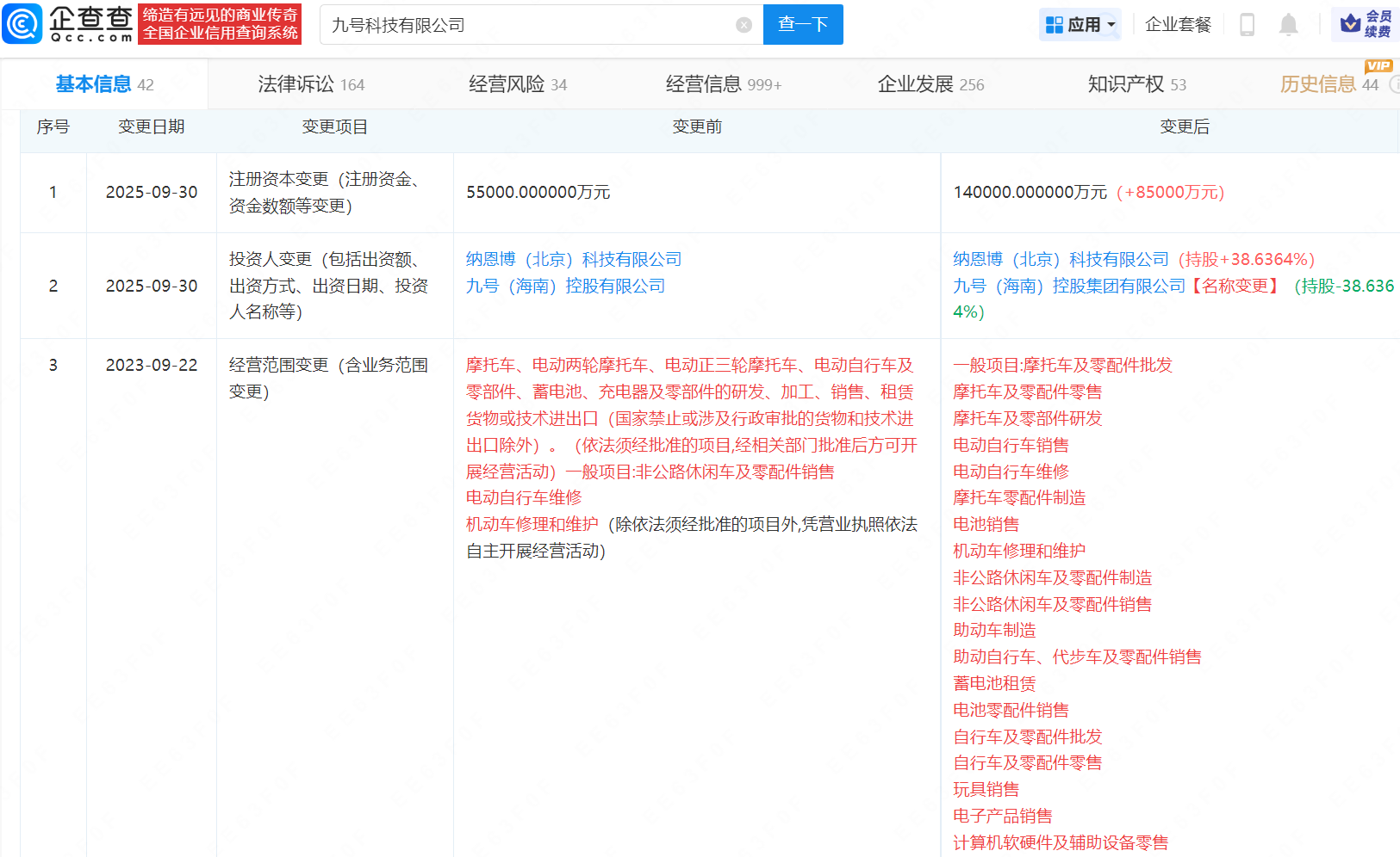 近日,九号科技有限公司发生工商变更,注册资本由5.5亿元增至14亿元,增幅约155%。企查查信息显示,该公司成立于2018年9月,法定代表人为张珍源,经营范围包含摩托车及零配件批发、助动车制造、电子产品销售等,由纳恩博(北京)科技有限公司、九号(海南)控股集团有限公司共同持股。