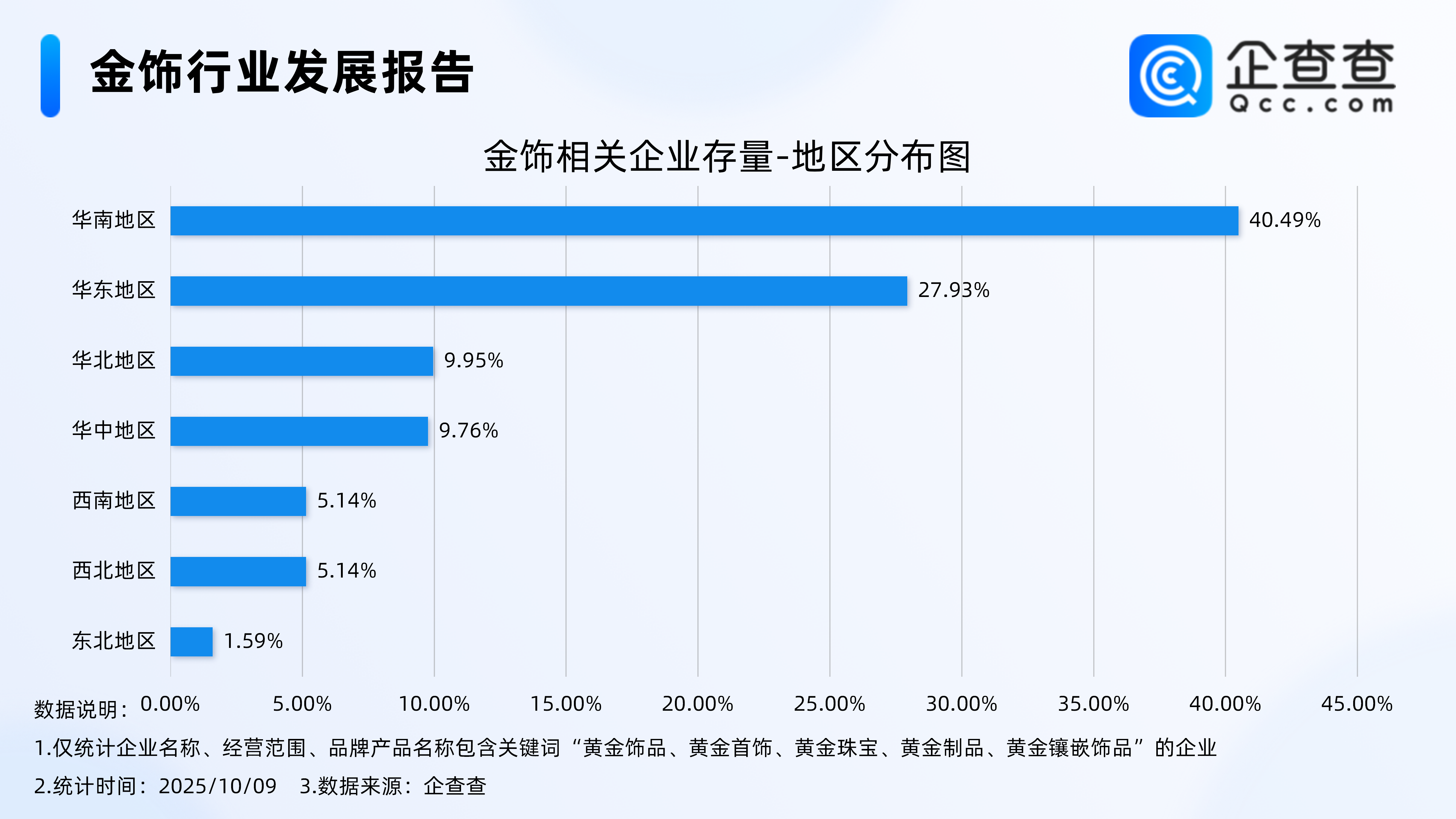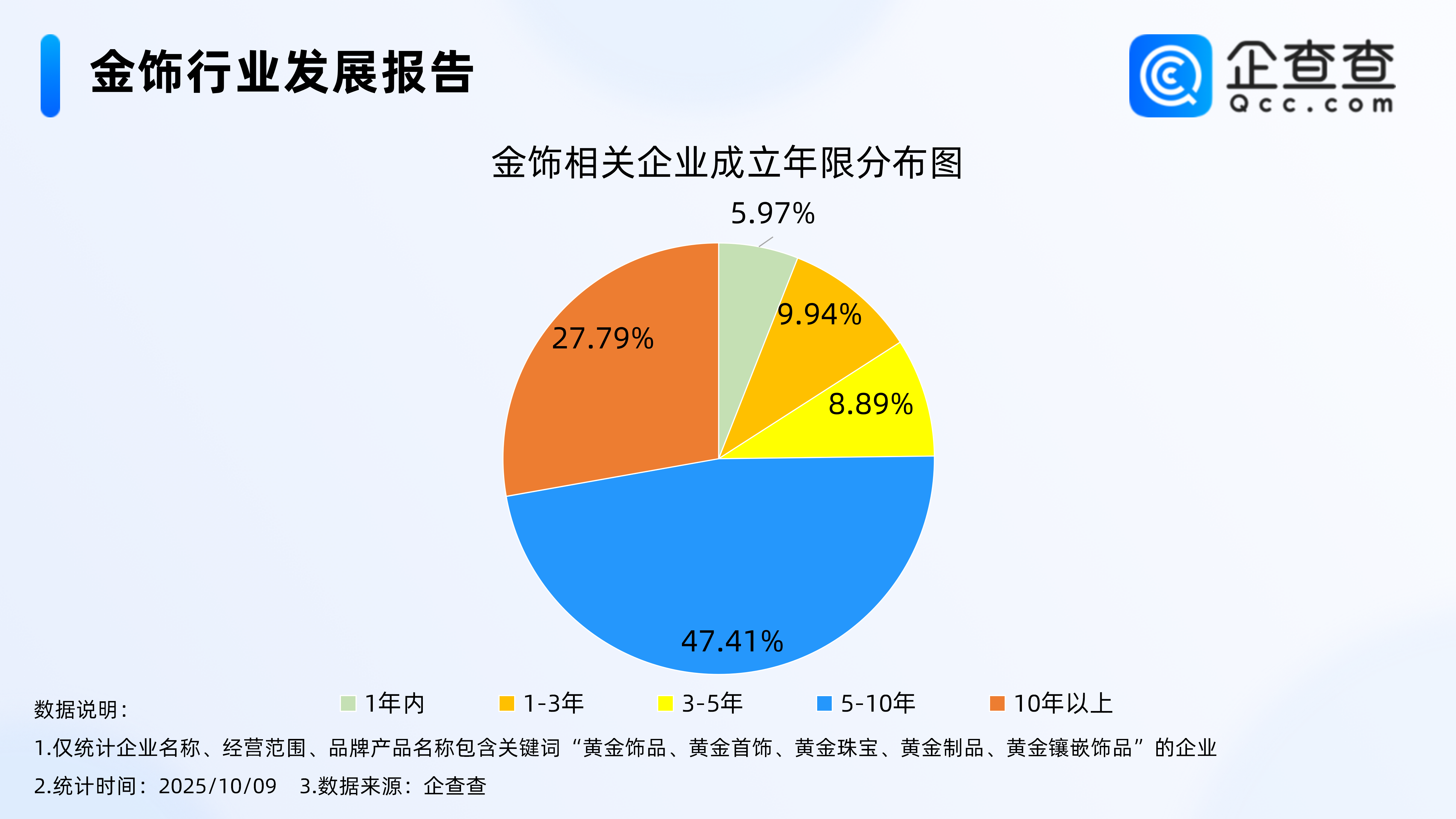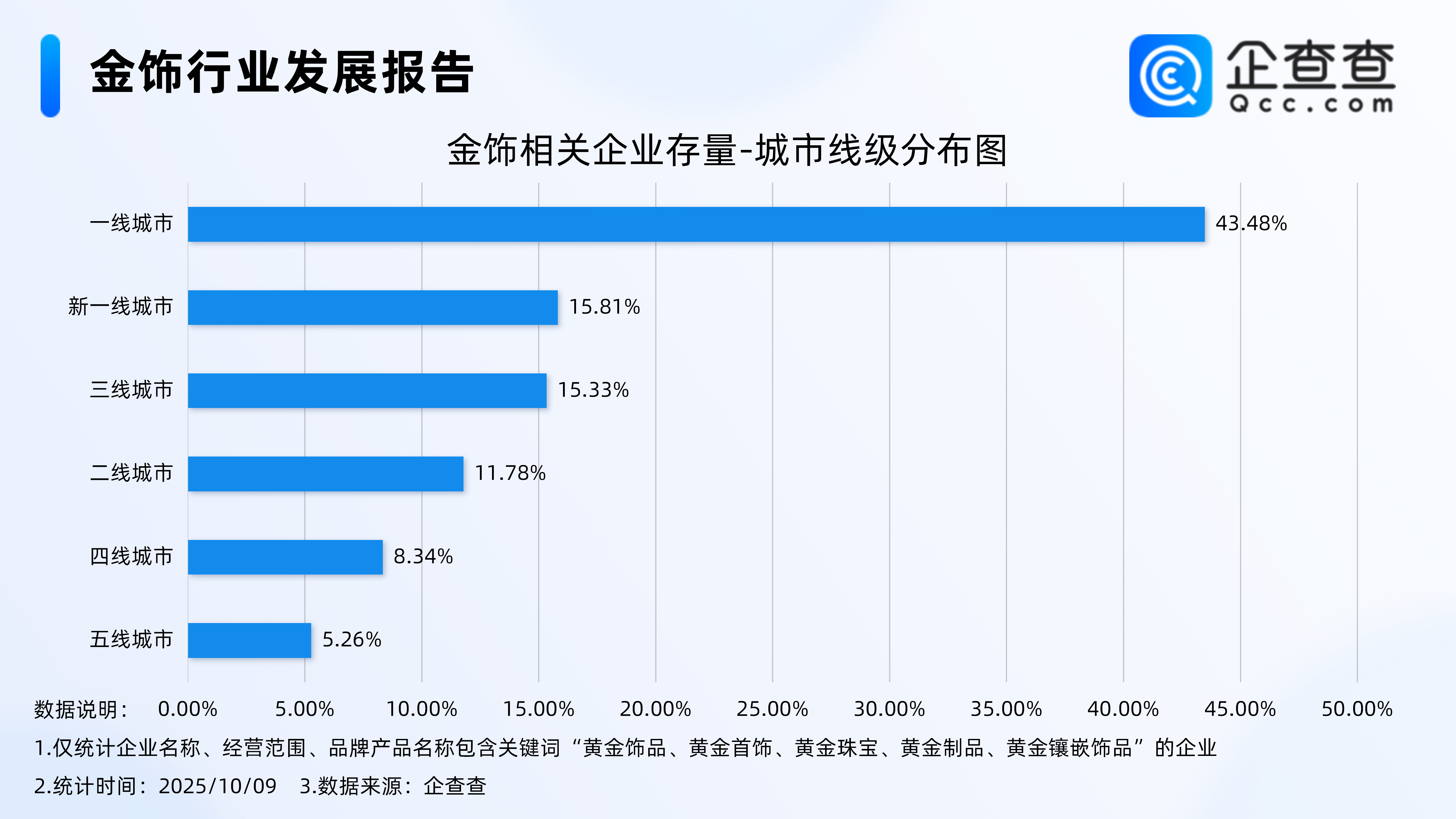 Wind数据显示,10月7日,COMEX黄金期货突破4000美元/盎司,创历史新高。10月8日,金价续涨,盘中一度触达4071.5美元/盎司的历史高点。国际金价上升也推动了黄金首饰价格的上涨。据媒体报道,国内多个金饰品牌克价跟涨,多家站上1160元/克。老庙黄金金饰价格达到1176元/克,周生生足金饰品标价达到1165元/克;周大福为1162元/克;老凤祥价格达到1160元/克。企查查数据显示,国内现存金饰相关企业6.34万家。从经营时间来看,金饰相关企业多为老牌企业,成立年限在5年以上的企业超七成。从地区分布来看,金饰相关企业具有高度地域集中性,密集分布在华南地区,占比达40.49%。从城市线级来看,金饰相关企业主要分布在一线城市,占比达43.48%。注册量方面,2024年全年注册4585家相关企业,同比增长8.37%。1.成立年限在5年以上的企业超七成